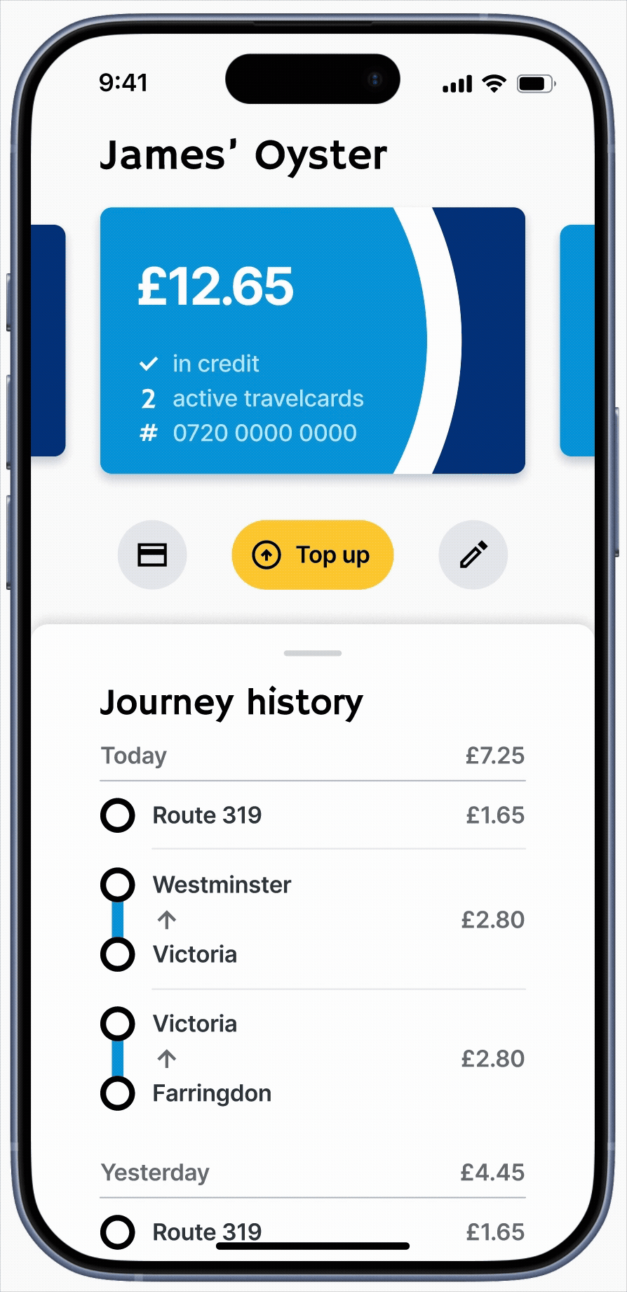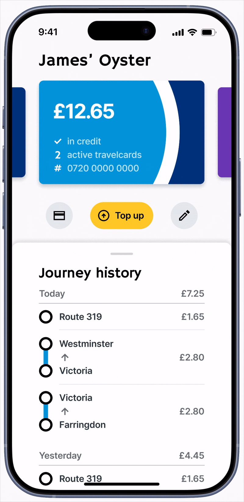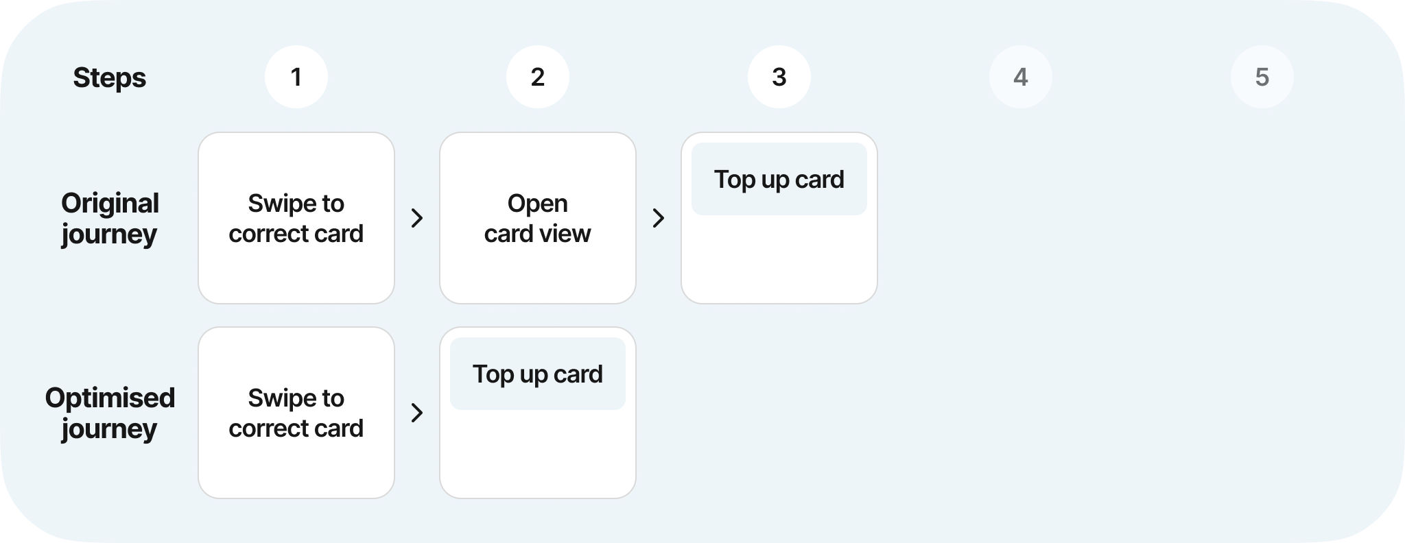 To understand how real commuters used the app, I challenged four members of the public at South Kensington tube station to complete the three tasks previously identified. Across all flows, users frequently struggled to find the correct entry point (especially for topping up or checking journey history), despite there often being multiple routes through the app to reach the desired goal. Certain UI elements, such as the main card element, were often assumed not to be clickable or swipable due to lack of affordances. Lack of visual cues on the cards also made them hard to distinguish, leading to confusion over which card they were viewing. In addition, small text also led some users to miss buttons or key information.