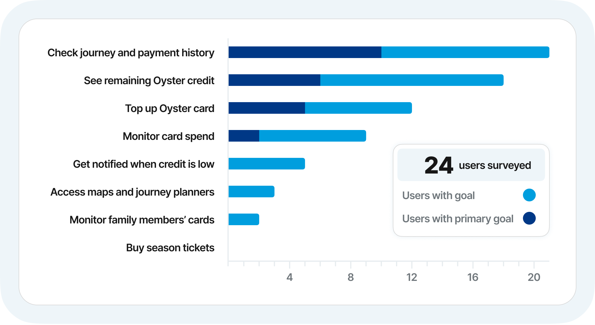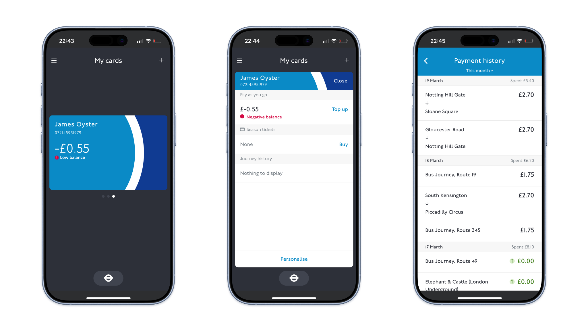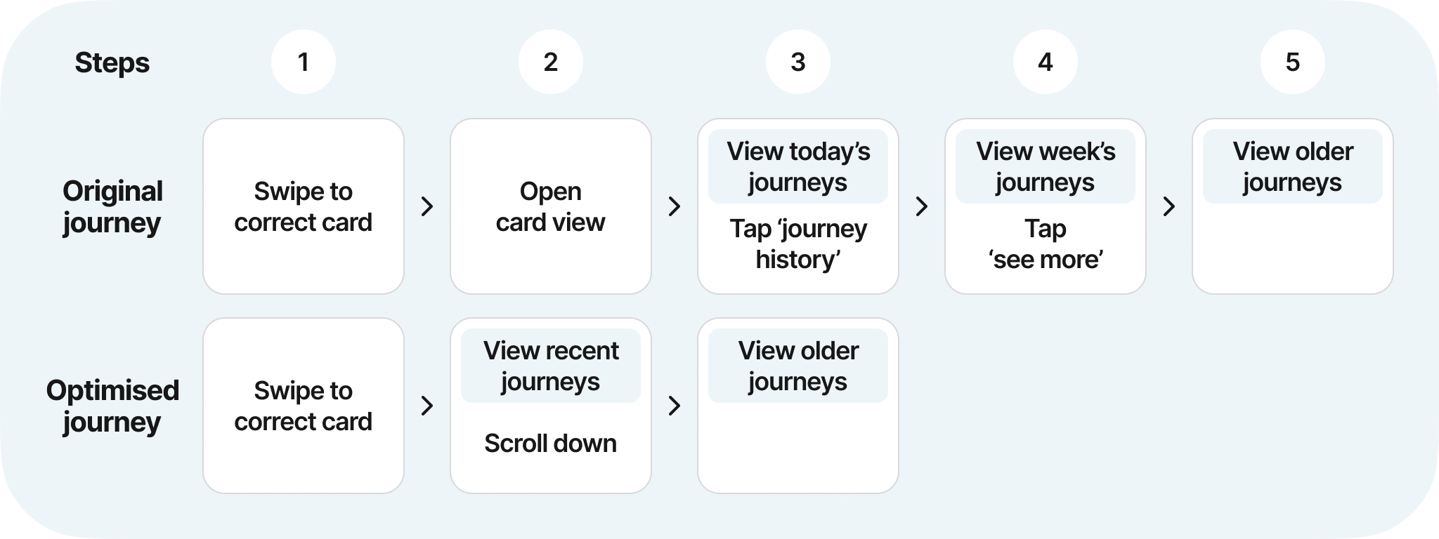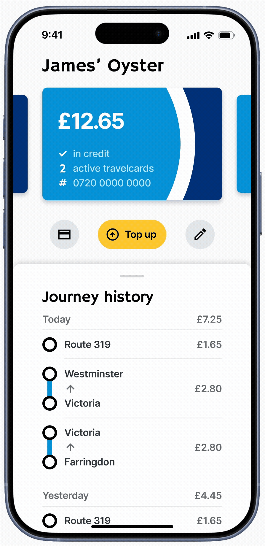 To understand how real commuters used the app, I challenged four members of the public at South Kensington tube station to complete the three tasks previously identified. Across all flows, users frequently struggled to find the correct entry point (especially for topping up or checking journey history), despite there often being multiple routes through the app to reach the desired goal. Certain UI elements, such as the main card element, were often assumed not to be clickable or swipable due to lack of affordances. Lack of visual cues on the cards also made them hard to distinguish, leading to confusion over which card they were viewing. In addition, small text also led some users to miss buttons or key information.